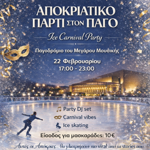 Σας προσκαλούμε όλους στο Αποκριάτικο – Μασκέ Πάρτυ που θα διοργανώσουμε στο Παγοδρόμιο του Μεγάρου Μουσικής…την Κυριακή 22 Φεβρουαρίου 2026!!!